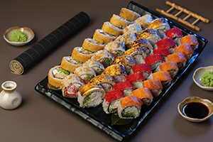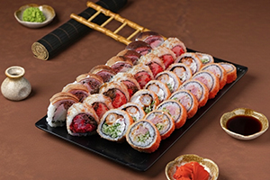8 Filadelfia, 8 Kalifornia, 8 Cheese Roll, 8 Bonita Roll 10 Hot Krab Roll, 10 Hot Salmon Roll, 8 Kappa Maki Roll, 8 Salmon Maki Roll (68 ədəd)
